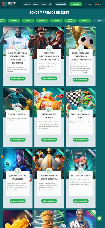 SI buscas más alternativas, añade a tu lista 22Bet, otra de las mejores casas de apuestas que operan en Honduras. De este modo, podrás aprovechar las oportunidades que te propone con su catálogo de bonos.